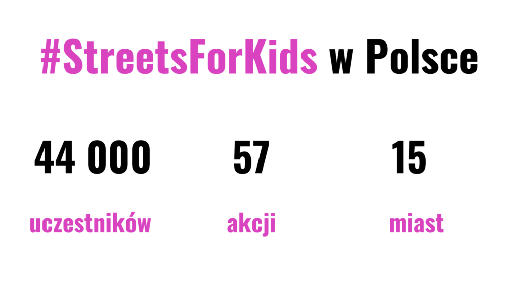 #StreetsforKids to akcja koordynowana przez Clean Cities Campaign, która odbywa się w ponad 20 miastach całej Europy. Jej celem jest zwrócenie uwagi władz lokalnych, rodziców, nauczycieli, dyrekcji szkół na to w jaki sposób tworzymy i do czego wykorzystujemy szkolne ulice w naszych miastach. Zamknięte dla ruchu szkolne ulice to , bezpiecznie dla dzieci przestrzenie, czystszego powietrze, więcej zieleni i życia.