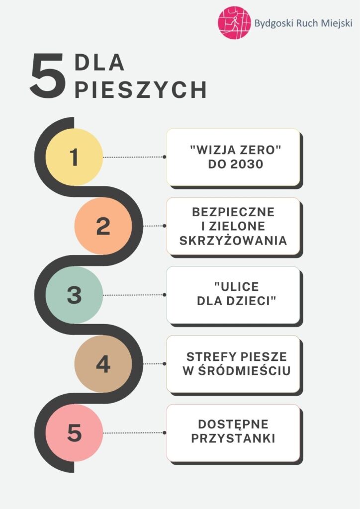 Jakby tego było mało zarówno poszczególne organizacje, jak i koalicje organizacji wypracowują konkretne postulaty skierowane na dostępne i bezpieczne dla pieszych miasta, również poprzez tworzenia szkolnych ulic. Bydgoski Ruch Miejski opublikował program “5×5 dla Bydgoszczy”, w którym w  “5 dla pieszych” widzimy szkolne ulice jako jeden z priorytetów.